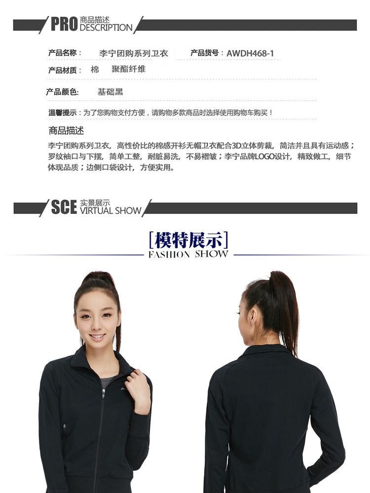 李寧(LI-NING)AWDH486-1 女子團購系列無帽開衫衛(wèi)衣基礎黑XL