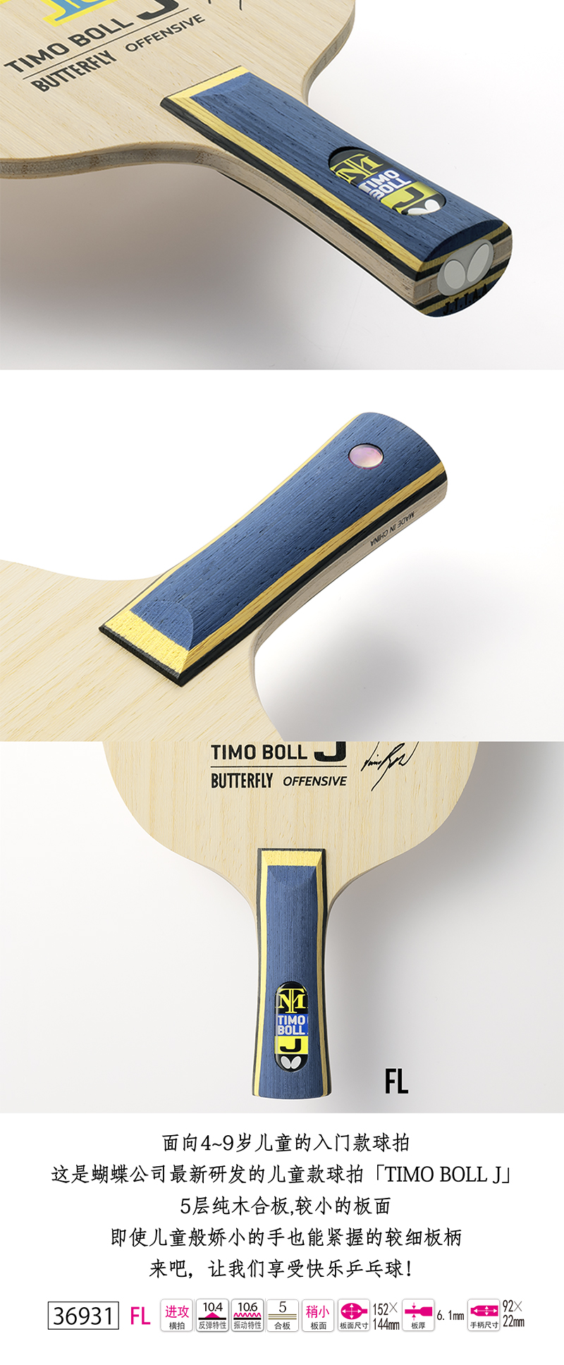 Butterfly蝴蝶36931 TIMO BOLL J-FL乒乓球純木底板 橫拍 重量輕,板面小 適合兒童的細(xì)型手柄